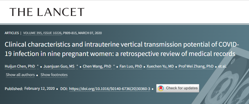 3. Chen H, etc. Clinical characteristics and intrauterine vertical transmission potential of COVID-19 infection in nine pregnant women: a retrospective review of medical records. The Lancet 2020; 395:809-815.