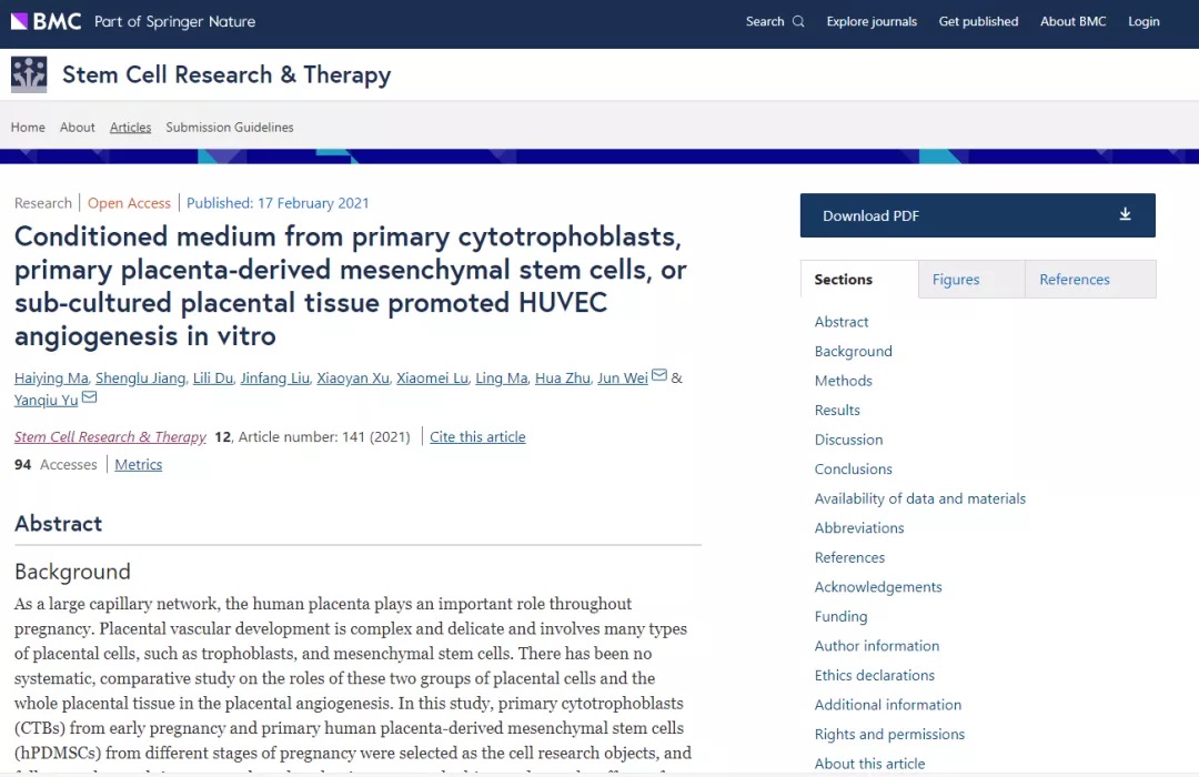 近日,沈陽細胞中心董事長于艷秋教授團隊在干細胞與血管再生領域研究上取得了新的進展,其成果“Conditioned medium from primary cytotrophoblasts, primary placenta-derived mesenchymal stem cells, or sub-cultured placental tissue promoted HUVEC angiogenesis in vitrol”在國際知名的專業期刊《Stem Cell Research & Therapy》(《干細胞研究與治療》)公開發表。本研究結果有助于推廣干細胞在心腦血管疾病、缺血性疾病等領域的應用。