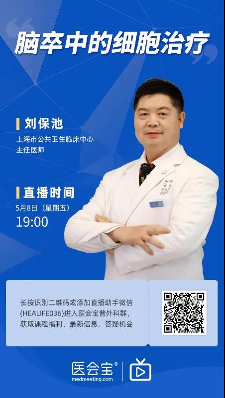 2020年5月8日(星期五)晚19:00,沈陽細胞中心特聘臨床細胞治療專家劉保池教授在線直播為您講解《腦卒中的細胞治療》。