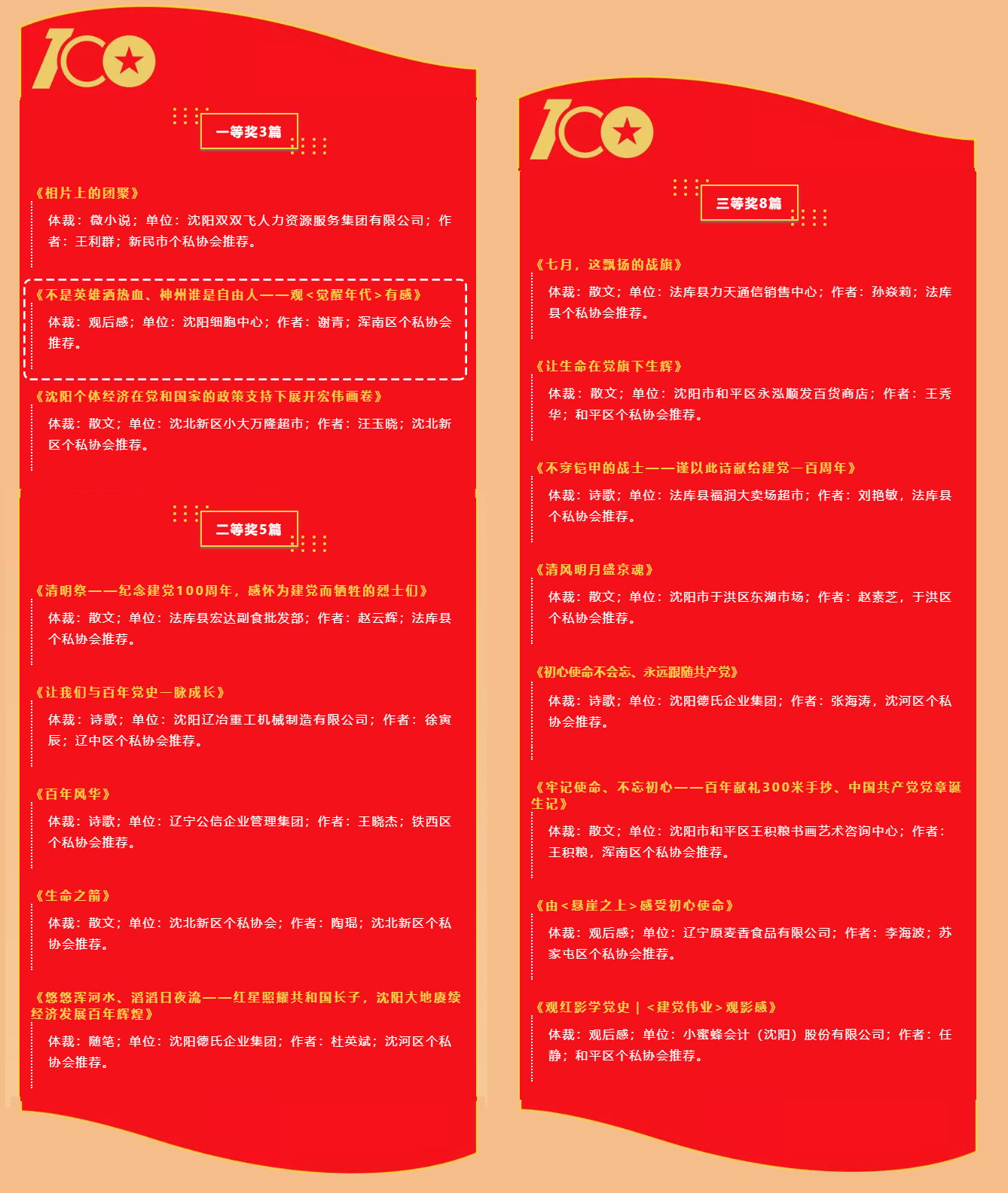 廣大會員企業單位將通過所在區縣協會選送參賽作品。近五十家單位或個人的參賽作品進入終審環節,經專家評委評審,評選出獲獎作品26篇,評出3個優秀組織獎。分別是:一等獎三名,二等獎五名,三等獎八名。為慶祝中國共產黨建黨100周年,謳歌沈陽市個體、私營經濟在黨和國家的領導下,發生的翻天覆地的變化,征文體裁多種多樣,涵蓋了通訊、詩歌、散文、微小說、讀書感、觀影感等。