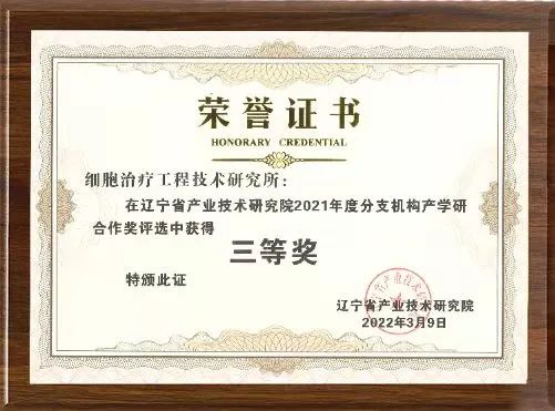 2022年3月9日,沈陽細胞中心在遼寧省產(chǎn)業(yè)技術研究院2021年度分支機構產(chǎn)學研究合作獎評中,獲得三等獎。