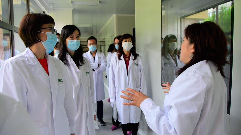 <于艷秋教授為到訪領導介紹沈陽細胞中心實驗室>