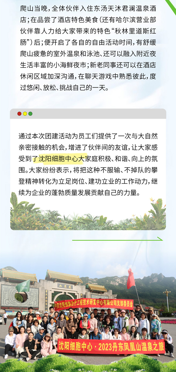 中共沈陽(yáng)細(xì)胞治療工程技術(shù)研發(fā)中心有限公司支部委員會(huì)為全面深入學(xué)習(xí)貫徹落實(shí)黨的二十大精神,展現(xiàn)新時(shí)代拼搏向上、積極進(jìn)取的良好風(fēng)貌,促進(jìn)企業(yè)員工的身心健康,豐富伙伴的業(yè)余生活,增強(qiáng)團(tuán)隊(duì)凝聚力、向心力和戰(zhàn)斗力,促進(jìn)部門(mén)間交流協(xié)作,旨在讓大家在團(tuán)建中默契成長(zhǎng),未來(lái)在工作中攜手并進(jìn),特別組織此次鳳凰山爬山 · 溫泉活動(dòng)。