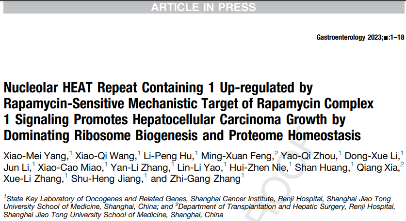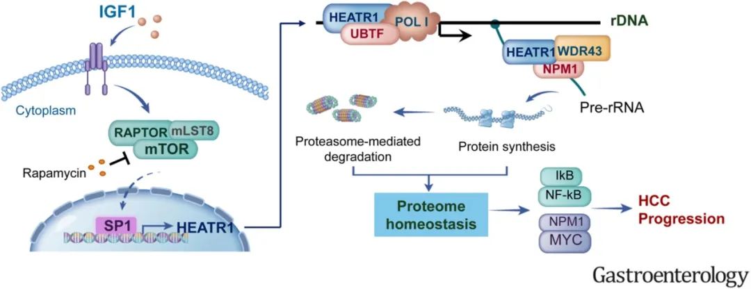 近日,沈陽細胞中心匯智研究院特聘專家、上海交通大學醫學院附屬仁濟醫院上海市腫瘤研究所腫瘤系統醫學全國重點實驗室張志剛研究團隊在Gastroenterology在線發表了題為Nucleolar HEAT Repeat Containing 1 up-regulated by Rapamycin-Sensitive Mechanistic Target of Rapamycin Complex 1 signaling promotes hepatocellular carcinoma growth by dominating ribosome biogenesis and proteome homeostasis的最新研究成果。該研究發現核仁蛋白HEATR1(HEAT repeat containing 1)是調控核糖體生成和肝癌進展的關鍵分子,揭示了其在IGF1-mTOR-SP1信號軸的作用下表達上調,驅動核糖體生物發生和蛋白質組穩態從而促進HCC發展的分子機制。