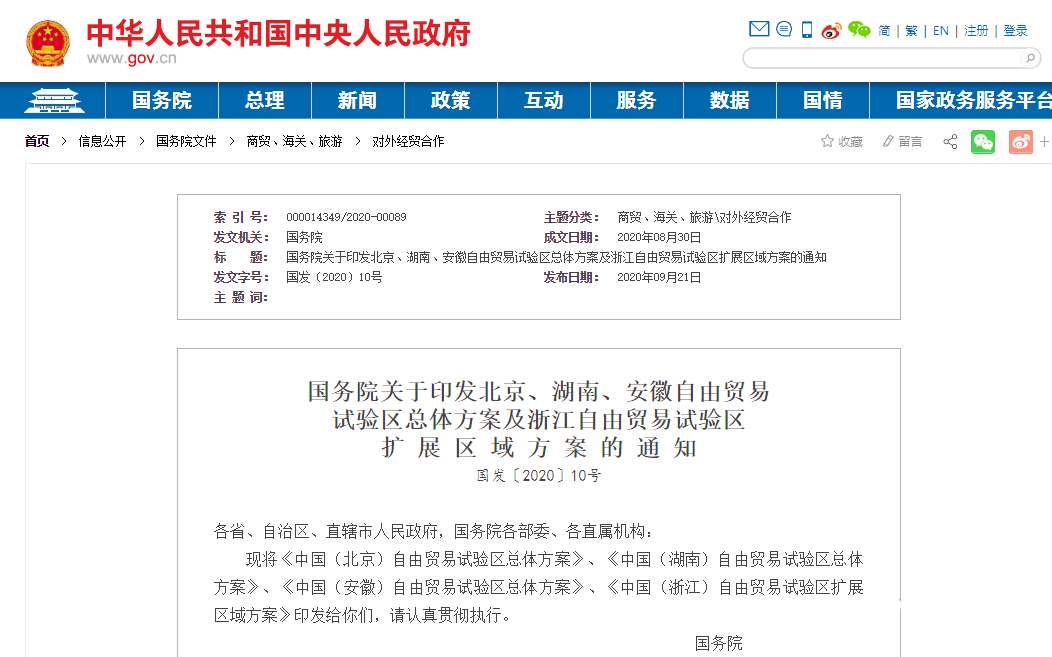9月21日,國務院發布《關于印發北京、湖南、安徽自由貿易試驗區總體方案及浙江自由貿易試驗區擴展區域方案的通知》。