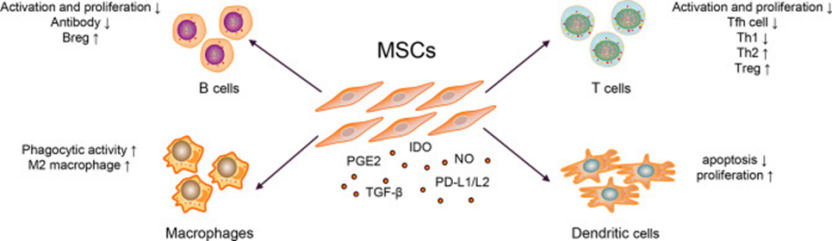 1,間充質干細胞(MSCs)具有強大的免疫調節特性,能夠糾正SLE這一自身免疫性疾病患者體內失衡的免疫系統。MSCs劑量依賴性地抑制狼瘡T細胞的G1/S期轉化和增殖,促進調節性T細胞(Treg)、抑制輔助性T細胞17(Th17)的生成來間接調控T細胞功能;MSCs促進狼瘡患者外周血耐受性CD1c+樹突狀細胞增殖并抑制其凋亡;MSCs通過MMPs剪切修飾自分泌的CCL2而抑制B細胞活化[1]。