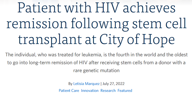 2022年2月15日,加州大學洛杉磯分校和約翰·霍普金斯大學的研究團隊在逆轉錄病毒和機會性感染會議(CROI)上報告了一個艾滋病治療案例:一名接受臍帶血干細胞移植治療急性髓細胞白血病的女性艾滋病患者,在停止艾滋病藥物治療后,已經長達14個月沒有檢測到HIV病毒了。成為第三例被治愈的“紐約病人”