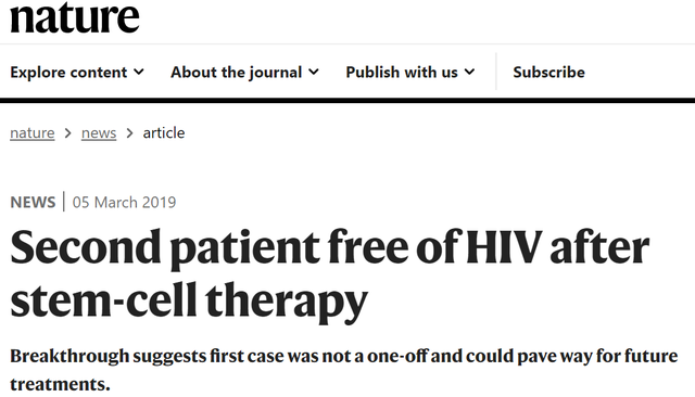 2019年3月5日,倫敦大學學院的拉溫德拉·古普塔(Ravindra Gupta)治療團隊發布在國際頂級學術期刊《自然》(Nature)上的研究顯示,英國一位被確診為晚期霍奇金淋巴瘤的“倫敦患者”,在2015年研究團隊為他移植來自具有艾滋病病毒抗性基因捐贈者的骨髓干細胞,干細胞移植后,HIV病毒完全從病人的血液中消失了。16個月后,病人不再服用抗艾藥物。2019年2月,他已經成功“停藥”18個月,仍然沒有病毒跡象。成為第二個“治愈”艾滋病的案例。